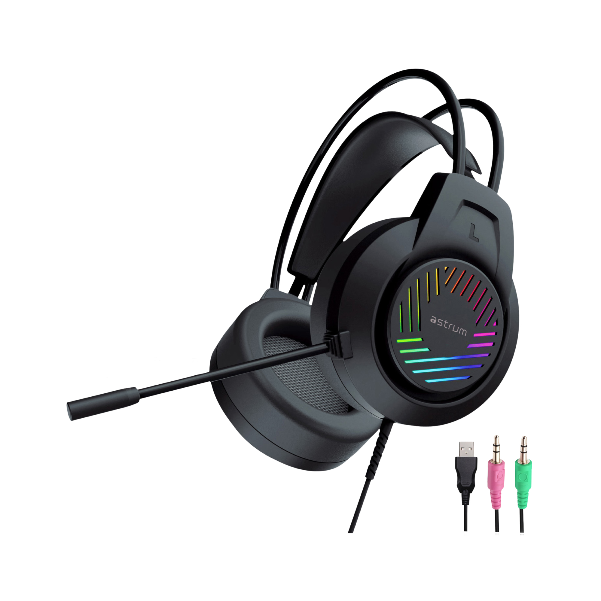 The Astrum HG100 Wired Gaming Headset is built to deliver immersive sound and clear communication for an enhanced gaming experience. Equipped with powerful audio drivers, it provides rich sound quality that brings games, music, and media to life. The adjustable boom microphone ensures clear and precise voice communication with teammates during gameplay. Featuring dual 3.5mm connectors for audio and mic compatibility, along with a USB connection to power the LED lighting, this headset combines performance with style. Designed for comfort, the soft ear cushions and adjustable headband make it ideal for extended gaming sessions.